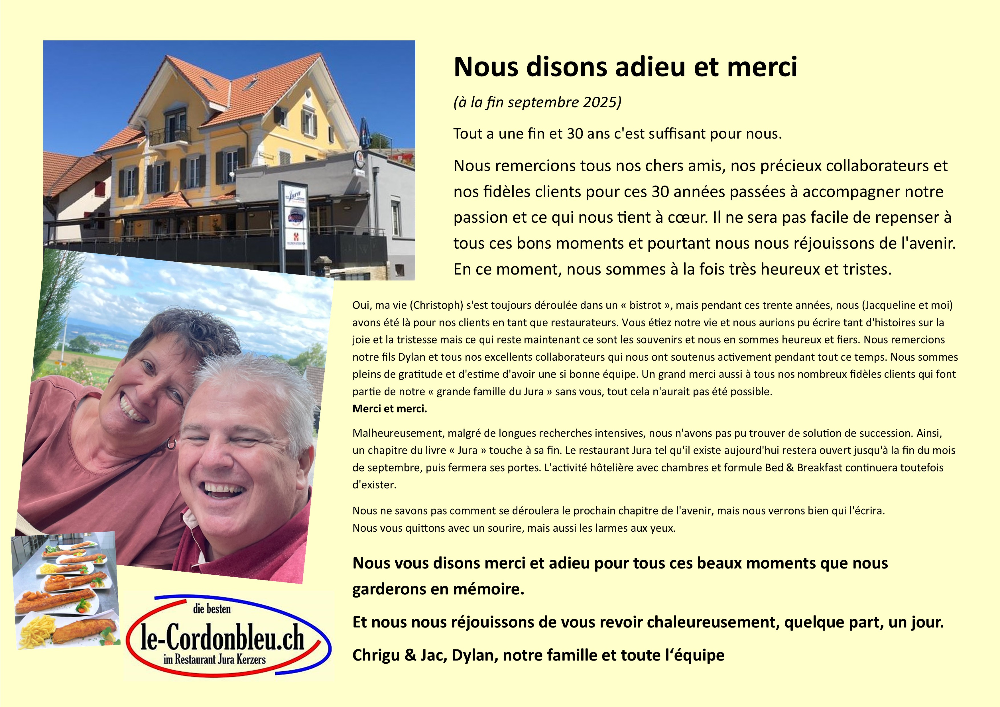 Hotel Jura l'activité hotelière reste ouverte 7/7, notre restaurant à définitivement fermé ses portes fin septembre. Tel 079 154 49 99