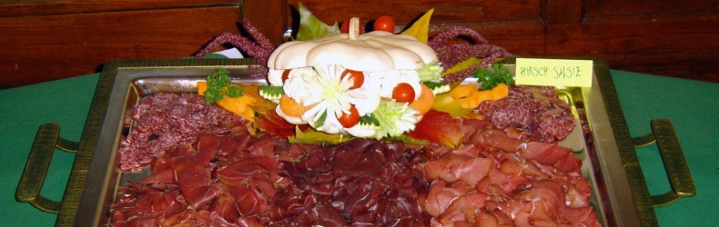Zum Anfang ein kaltes Buffet, mit vielen kleinen Köstlichkeiten aus dem Wald und vom Feld. Kalte Terrinen, Pasteten, getrocknete und geräuchte Wildspezialitäten, Würste, heisse Suppe, verschiedene Salate.